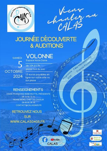 Si le cœur vous en dit, n’hésitez pas à venir chanter avec nous ! Pour connaître la date de cette journée, surveillez notre site dès la rentrée scolaire. Vous pouvez aussi vous inscrire à notre lettre d'information, le feuillet de CALAS, et vous serez informé-e-s par mail. Suivez nous sur Facebook, page CALAS.